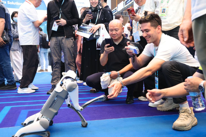 4月15日,在第137届广交会服务机器人专区,客商跟机器人互动。4月15日,有“中国第一展”之称的广交会迎来第137届。15日至19日举行的广交会第一期以“先进制造”为主题,首次增设服务机器人专区。第一期突出先进产业和科技支撑,参展企业达11304家,其中“新三样”、数字技术、智能制造相关题材参展企业约3700家。新华社记者 卢汉欣 摄