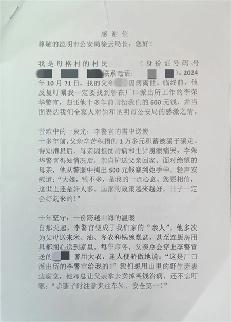近日,有群众给昆明市公安局局长写了一封信,800余字内容,点名要找昆明市公安局五华分局厂口派出所民警李荣华还钱。