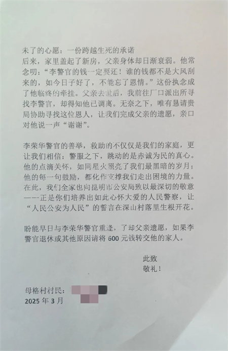 “我的父亲因病去世临终前,反复叮嘱我一定要找到曾在厂口派出所工作的李荣华警官,归还他十多年前借给我们的600元钱……”