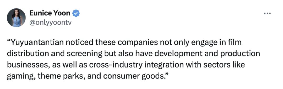 美媒的一位记者还专门在社交媒体上援引玉渊谭天的观点说,由于美国文化产业的核心盈利点确实在于知识产权和品牌价值。因此,如果中国消费者开始在电影领域对美国产品“降温”,这种趋势很可能会进一步外溢,影响到其他依赖美国IP和品牌溢价的行业。