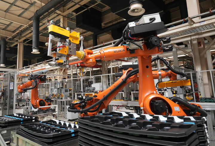 在位于江苏无锡市的一汽锡柴惠山工厂,智能制造车间里的协作机器人在作业(2024年6月3日摄)。新华社记者 李尕 摄