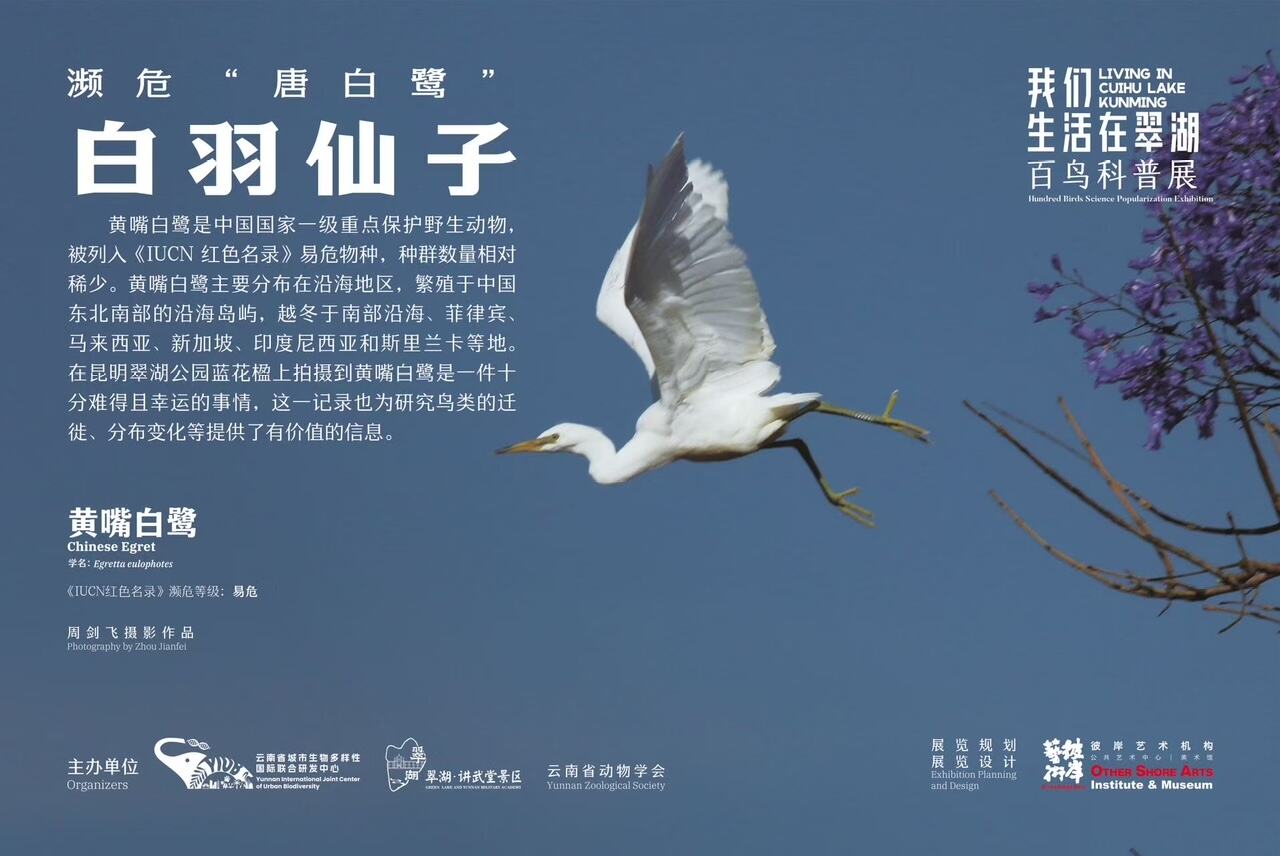 据介绍,此次展览将集中展出国内外专业鸟类研究者长期记录和拍摄的观鸟摄像作品,黄嘴白鹭、中白鹭、钳嘴鹳们露出锋利的鸟喙和尖利的脚爪,半身没入浸水的草地,羽翼在风中飞扬,传递出灵动、优雅地翱翔之姿。通过展示鸟类的灵动瞬间,为翠湖鸟类留下一张张珍贵的影像资料。