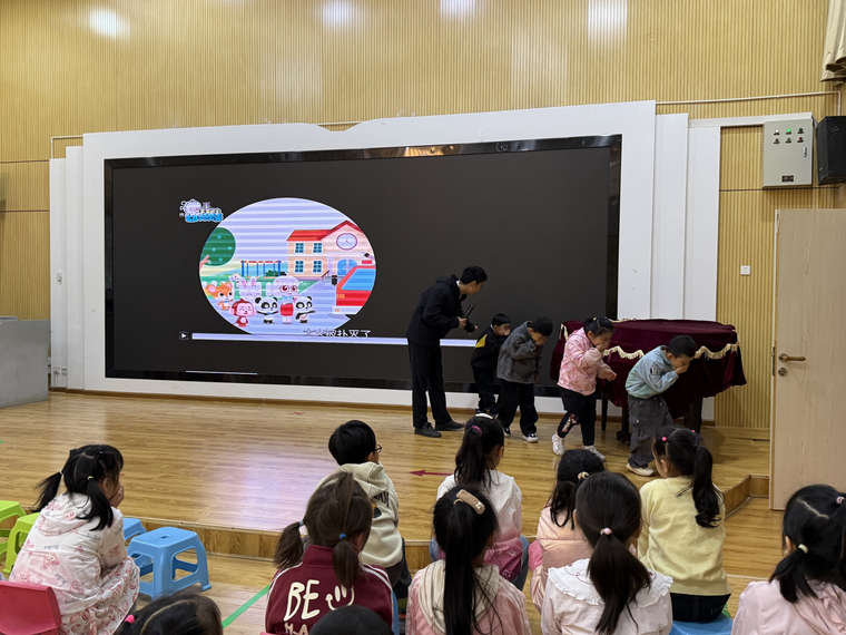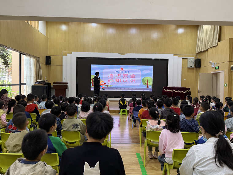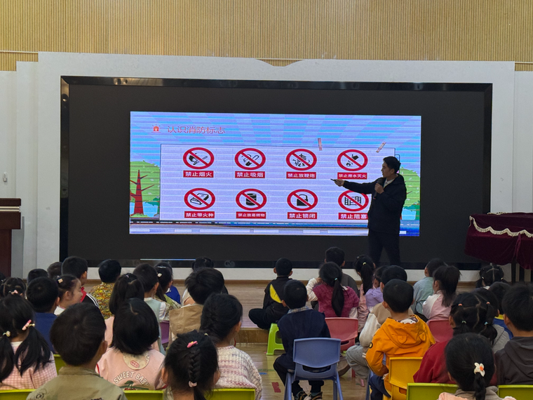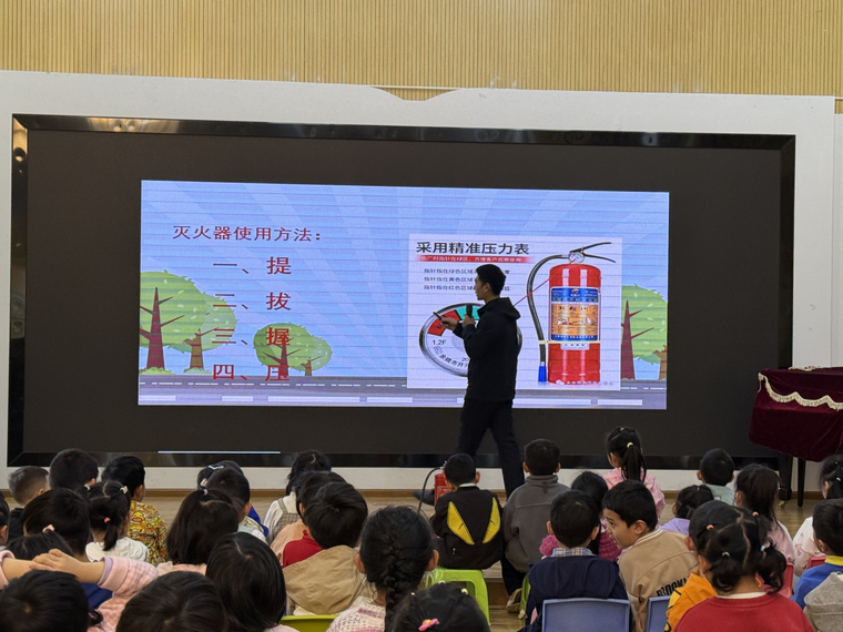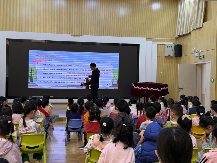 “小朋友们,如果遇到火灾,应该拨打什么电话?”“怎样弯腰才能最快逃离烟雾?”活动中,消防员化身为“安全老师”,结合孩子们的认知特点,通过动画视频、展示图片、情景模拟和互动问答的方式,用通俗易懂的语言带孩子们认识消防器材、消防标志,讲解火灾的危害、报警的正确方法以及火场逃生技巧。孩子们认真聆听,踊跃举手回答问题,在轻松的氛围中掌握了“捂住口鼻、弯腰前行”“不乘坐电梯”“寻找安全出口”等关键自救知识。