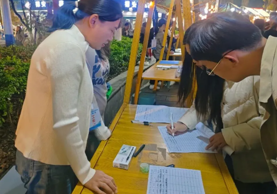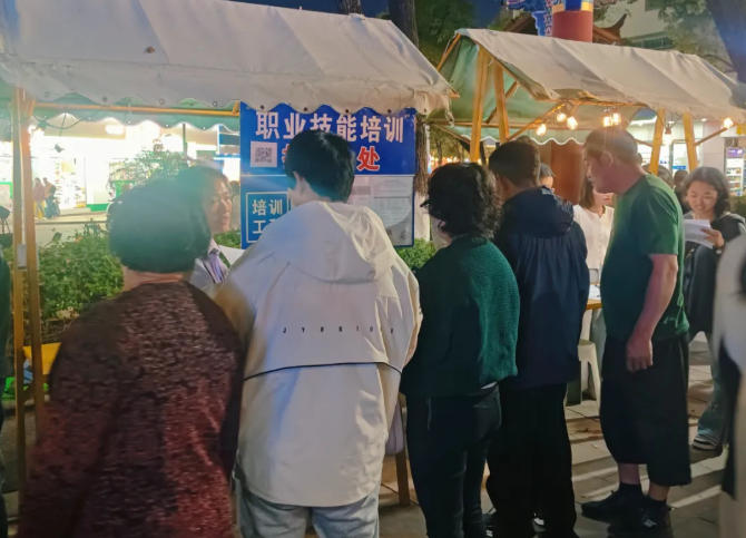 夜市灯火璀璨,求职者们三两成群,与亲友相伴,悠然漫步其间。他们在招聘海报前驻足浏览,并不时扫码登记信息,将原本的“休闲时光”悄然化作求职机遇。另一边,企业招聘人员主动递上精心准备的岗位信息传单,耐心介绍着企业的各项优势与岗位详情。