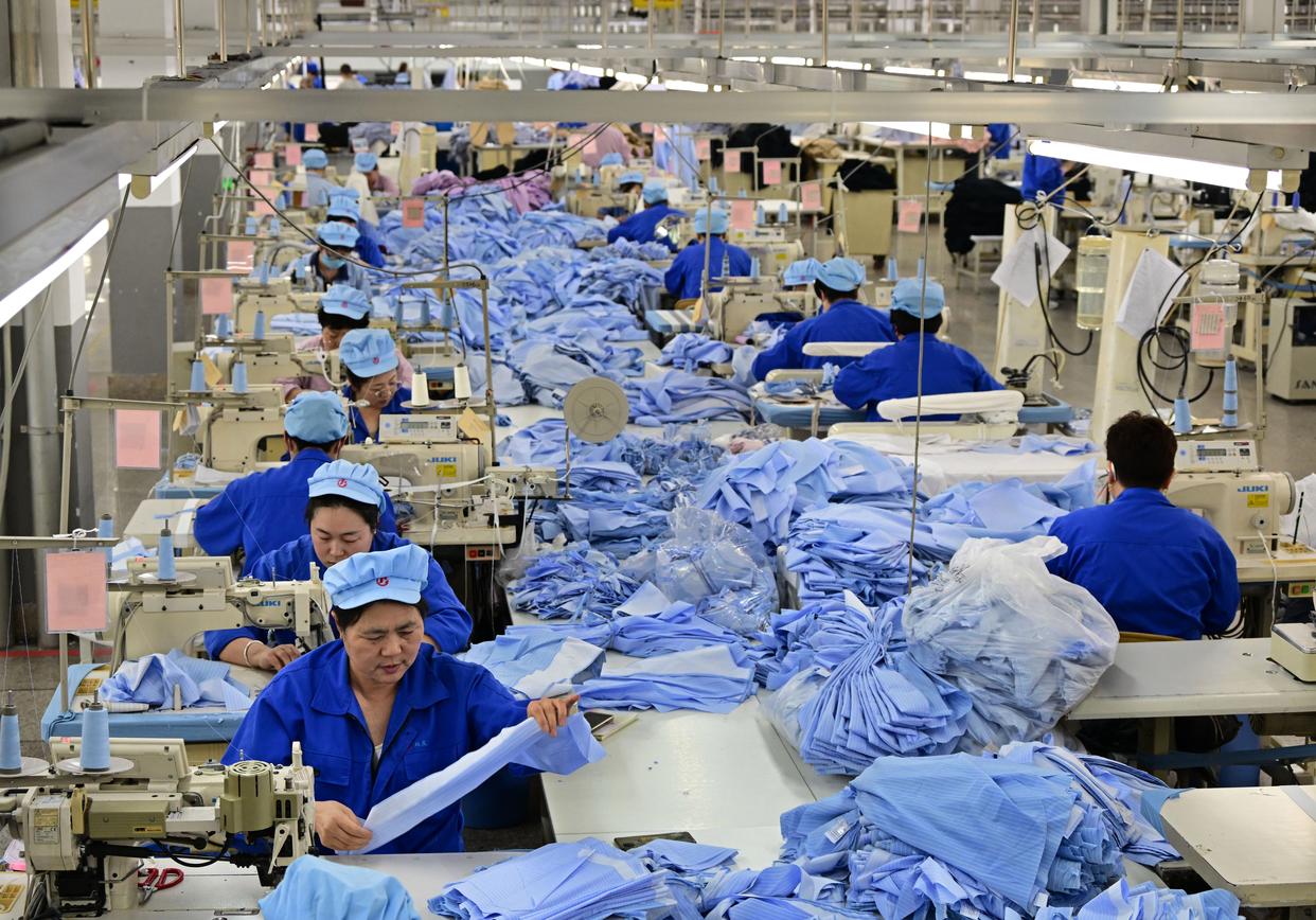 3月25日,山东青岛即墨区即发工业园内一家服装企业的职工在使用智能缝纫机进行生产。新华社记者 李紫恒 摄