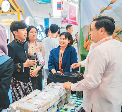 第21届中国—东盟博览会暨中国—东盟商务与投资峰会现场,参观者在老挝馆选购商品。李健 摄(人民视觉)