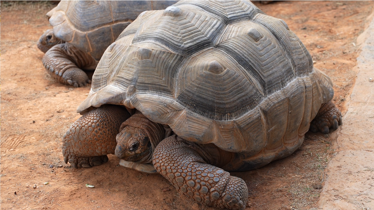 而亚达伯拉象龟,则将“佛系”通勤演绎到了极 致 , “大绿豆”和“小绿豆”的通勤距离只有 10 米左右,但是却需要 30 分钟才能到达“工位”,两只亚达伯拉象龟作为世界第二大陆龟,保育员无法搬动它们,每天只能跟在它们后面,等着它们走两步歇一会儿,慢悠悠地挪到工位后,开始享用保育员精心搭配好的早餐。亚达伯拉象龟主要在清晨和傍晚不到四个小时内活动,每天的早餐主要以生菜、紫甘蓝、彩椒、黄瓜及补充微量元素的龟粮为主,成年雄龟体重可达 250kg 左右,成年雌龟体重可达 160kg 左右。
