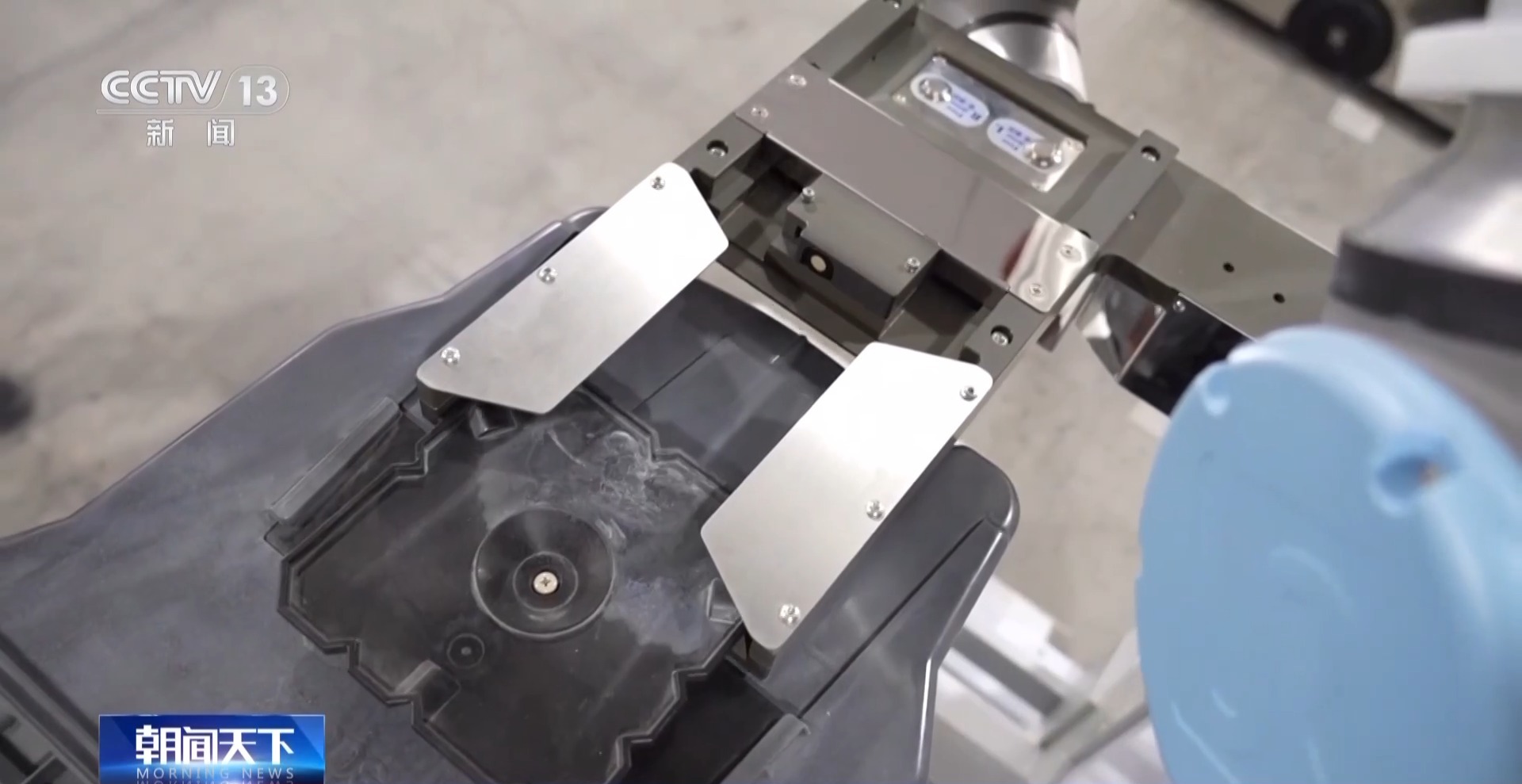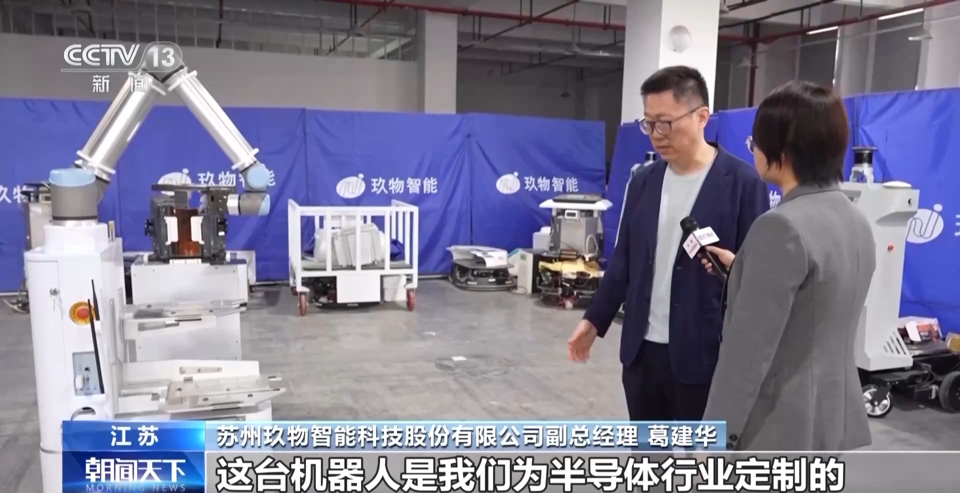 苏州玖物智能科技股份有限公司副总经理 葛建华:这台机器人是我们为半导体行业定制的。我们现在抓取的这个设备,其实是一台晶圆盒,这个晶圆片模型其实特别薄、特别脆,震动稍微厉害一点就会有裂痕,机械臂的精度可以达到0.1毫米。
