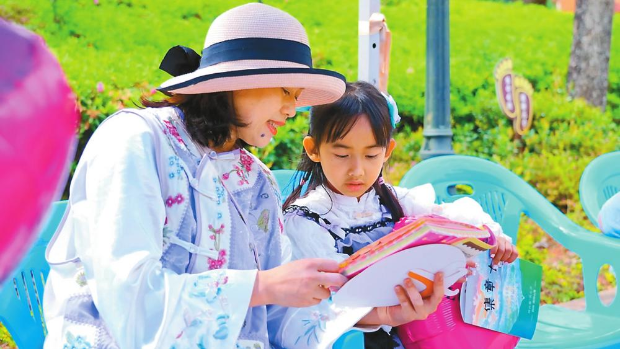 龙陵县市民和孩子一起阅读。