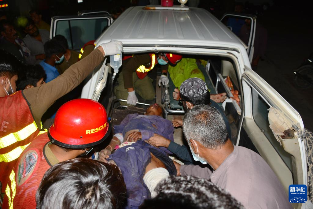 4月22日,在巴基斯坦南部信德省贾姆肖罗地区,救援人员将一名交通事故中的伤者送往医院。新华社发