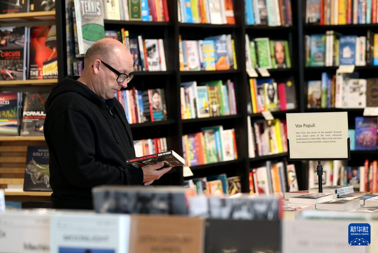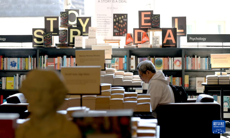 4月17日,一名男子在位于英国伦敦皮卡迪利大街的水石书店内阅读。