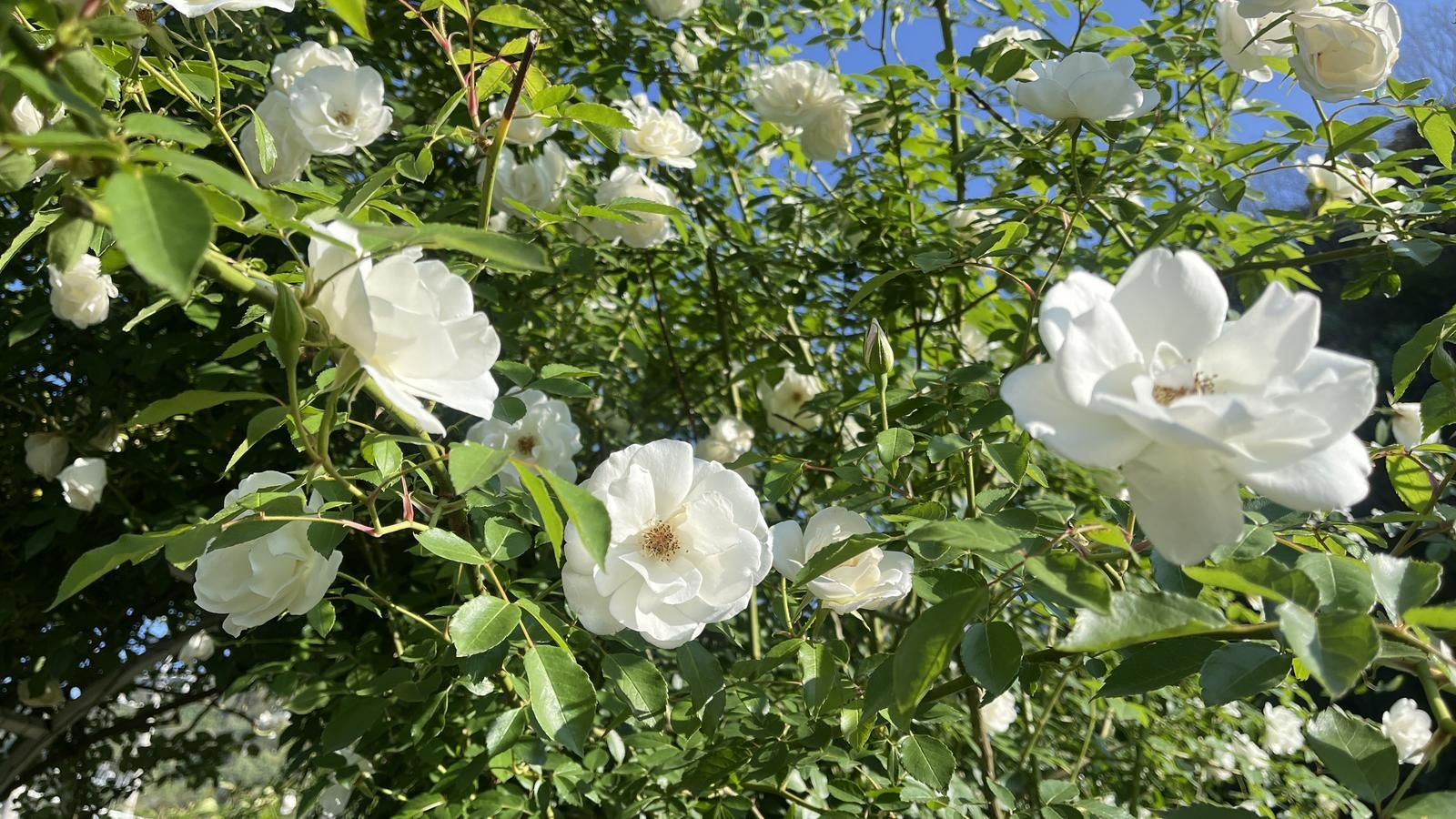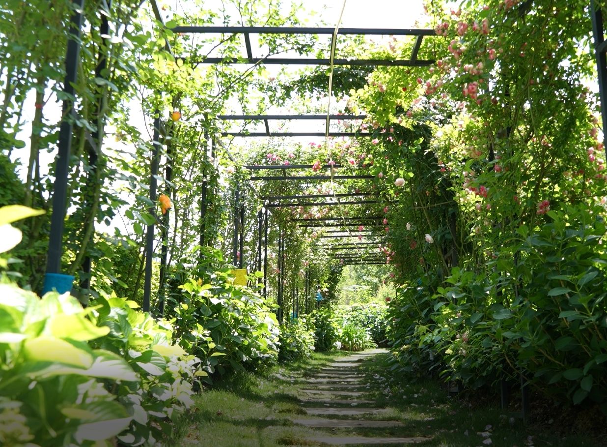 轻叩木门,走进向往的花园,仿佛步入了时光隧道,让人沉醉其中,不问世事。漫步花架下,数百种月季花争奇斗艳,各种颜色的月季或炽热或明媚或清冷。走在花径间,绣球花静静绽放,在那翠绿的枝叶间,仿佛是无数彩蝶翩翩起舞。放眼望去,铁线莲、大丽花、朱顶红、中华木绣球等花卉正在花园一隅悄悄绽放。