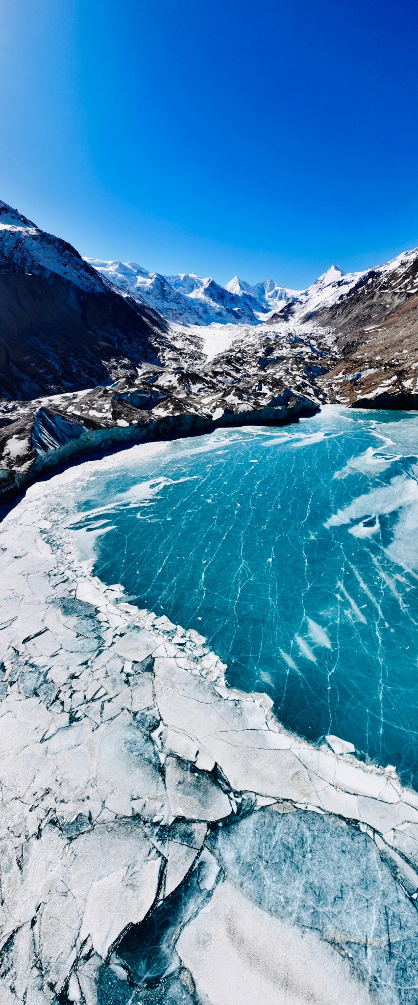 欣赏完冰洞,游客又往与村落相隔不足2公里的祥格拉冰川方向走去。冬季祥格拉山脚下的冰川在零下的温度冻结,冰层延伸到雪山脚下,一眼望去“蓝白黑”交相呼应,雄伟壮阔美不胜收。