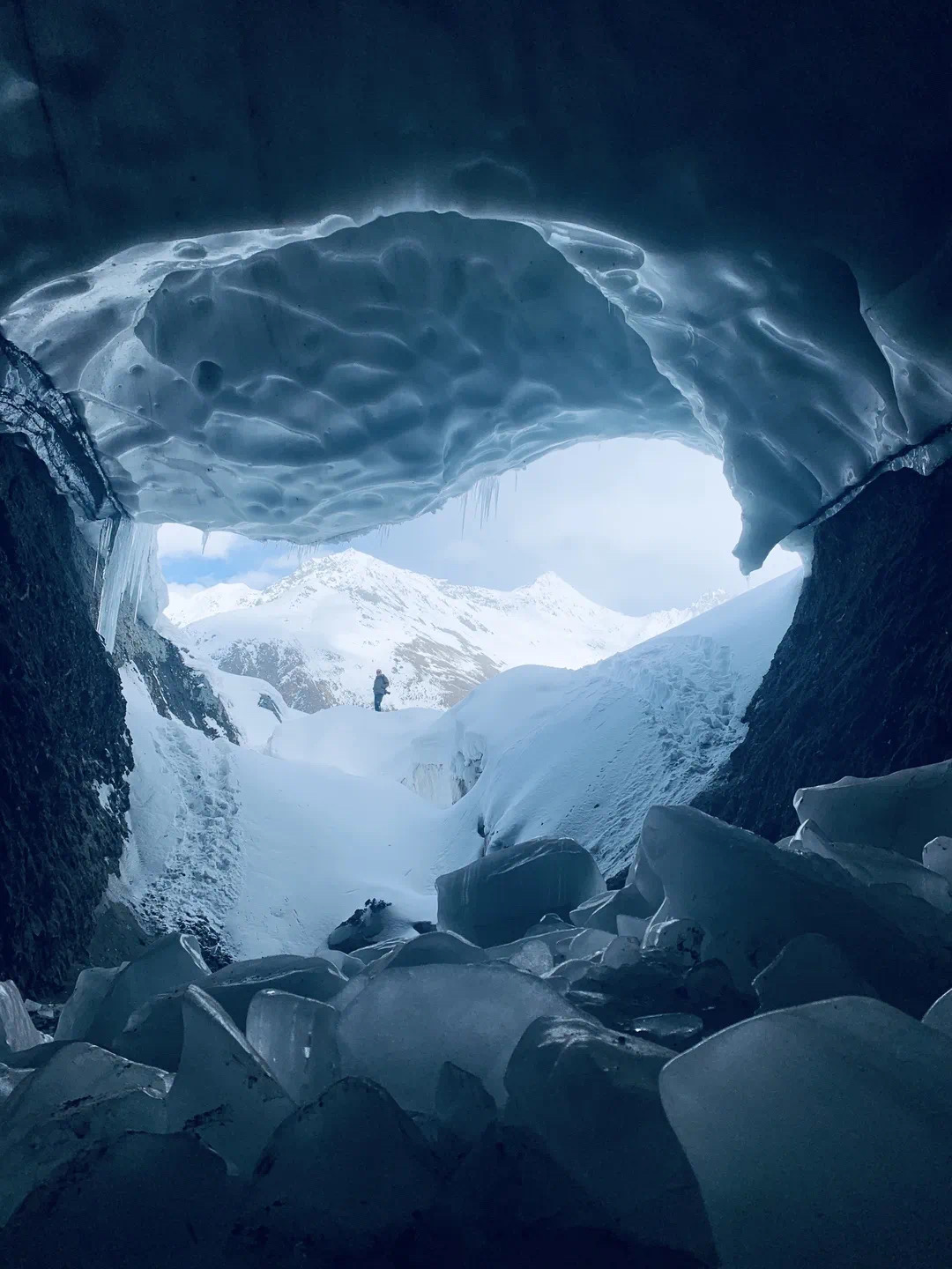 冰洞入口高约1米,需要弯着腰才能进入。待完全进入后,空间逐渐开阔,冰洞内别有洞天。冰壁深处透着蔚蓝,似是把边坝的蓝天锁了进去。冰洞最开阔的地方有一处冰台,游客在那里打卡拍照,记录下这绝美的风光。