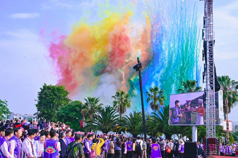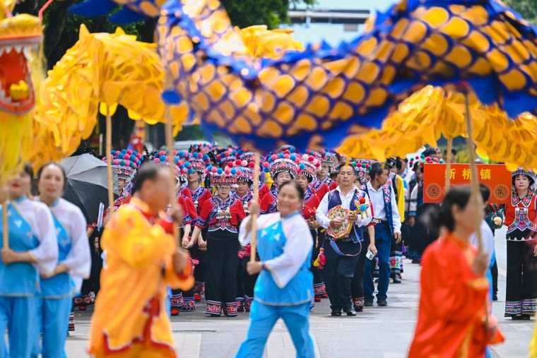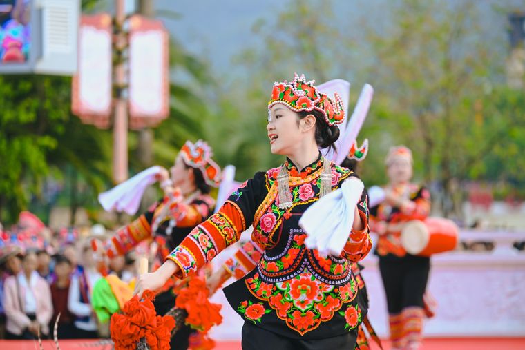 “三月会”的另一个重头戏——非遗巡演以化湖广场为起点,沿县城主街道巡演至彝和园,舞龙舞狮、高台社火、彝族刺绣等非遗项目纷纷亮相,表演者们身着华丽的服饰,用精湛的技艺,为四海宾朋展示着牟定非遗文化的独特魅力。
