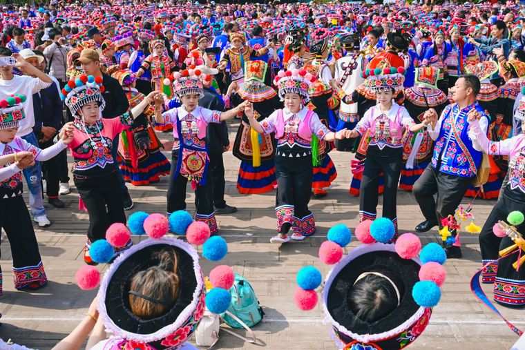 彩烟升腾,左脚调响起,上百列衣饰绚烂的纵队咚咚地跳起左脚舞,就像蛰伏的彩龙忽然快乐地悦动。中间的长方形领舞高台上,7支领舞队依序上台跳着不同的左脚调,带领全场热舞。“哈呢宝贝”的歌声响起,上万人随着高台上领舞的女子挥动双手,双花帽上的绒球也随着节奏俏皮地颤动。火到国外的“打歌”今天回到了家乡——正宗的云南打歌就是来源于彝族的左脚舞,早在千百年前,彝家人就跳着咚咚的舞步硬控登场。