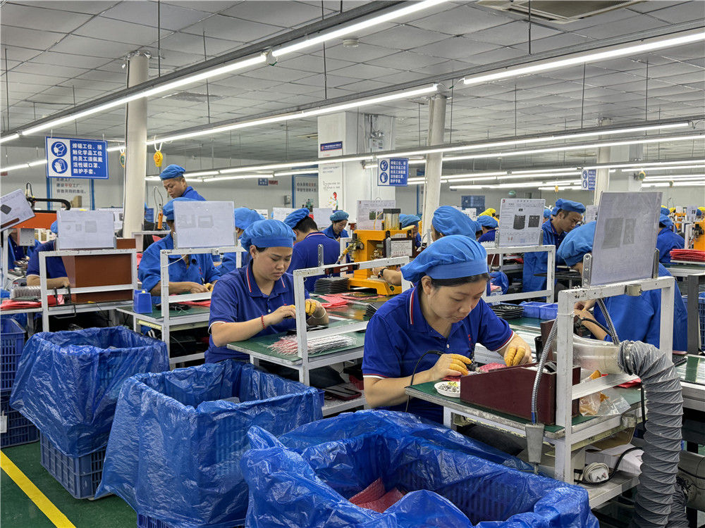 工人在广西北流泰宏达电子有限公司车间内忙碌(2024年12月9日摄)。新华社发(李洪健 摄)