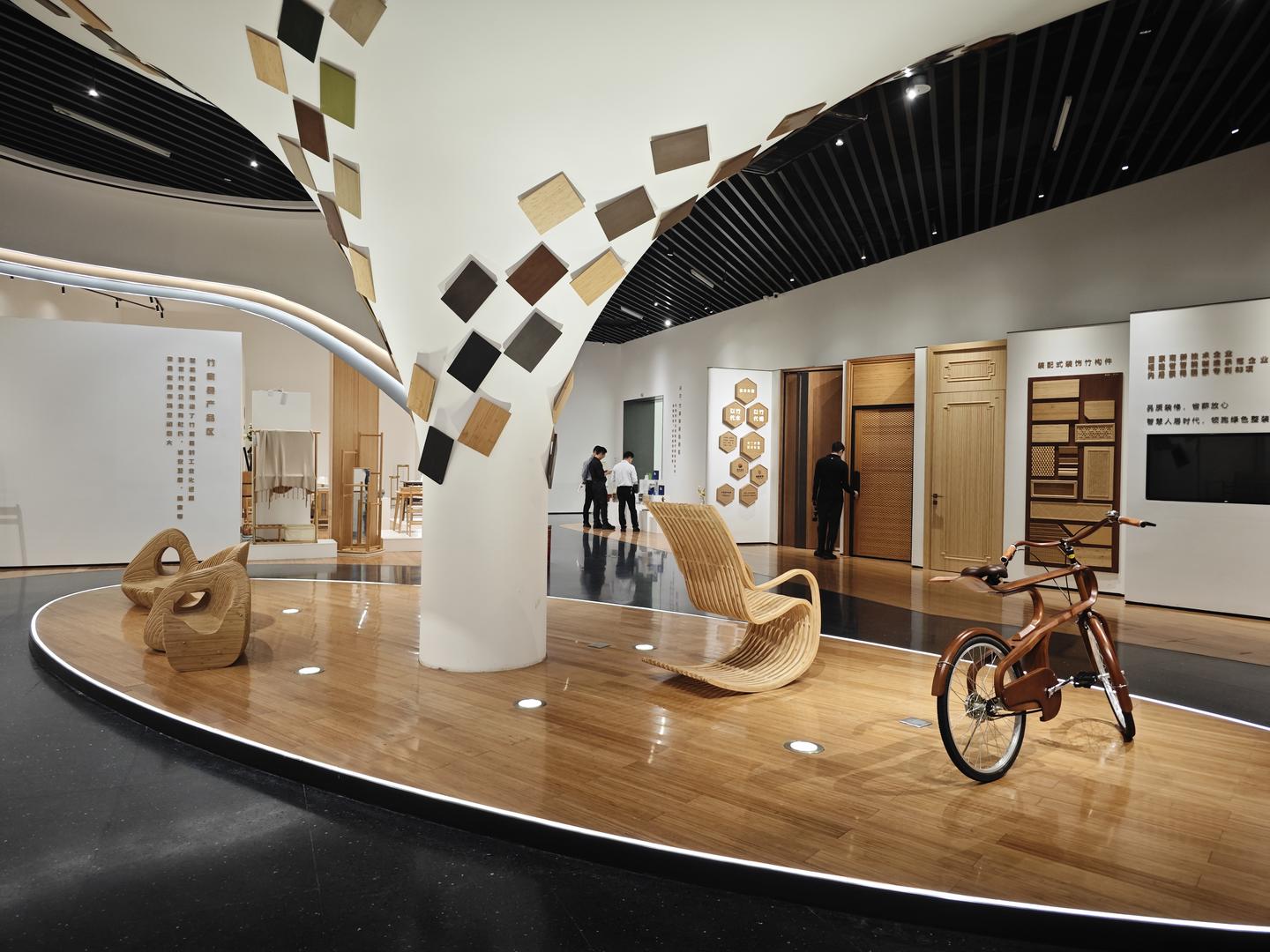 在邵武竹立方科创馆,一款竹制自行车吸引了人们的目光。这款自行车除了车轮、链条、脚踏板等部件为其他材质,整个车身、座椅完全是由竹子制成。灯光照射下周身显现出木质家具的厚重光泽。不时有参观者在场馆内试骑。