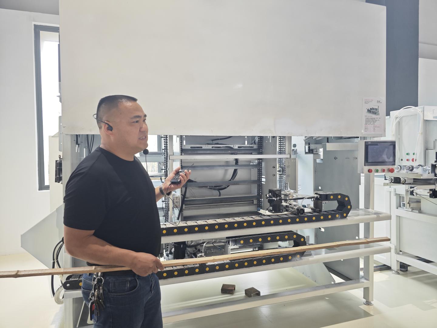 ▲钭伟勇介绍竹加工设备