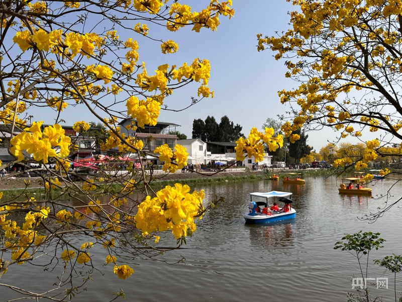 四月芳菲盛,踏青正当时。近日,四川省简阳市东麓花溪的千亩黄花风铃木迎来盛花期,金黄花海不仅吸引八方游客纷至沓来,更催生出多元消费新场景,让“鲜花经济”绽放出独特魅力。