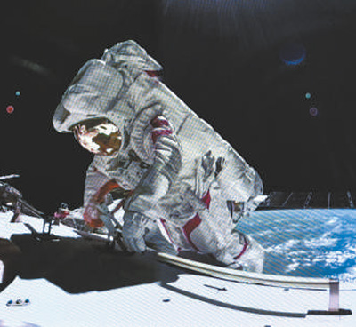 神舟十七号航天员汤洪波在空间站组合体舱外作业画面。新华社记者 李贺摄