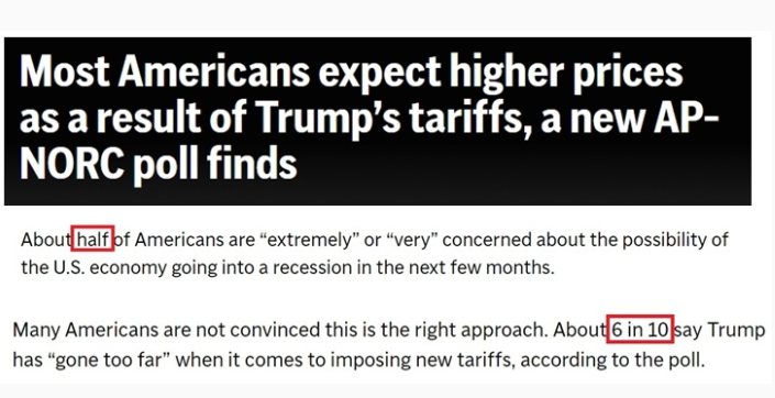 对于特朗普政府的关税政策,近六成的受访者认为政府“做得太过了”。另外,约有一半受访者“极度”或“非常”担心美国经济会在未来几个月陷入衰退。