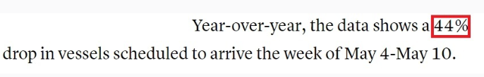美国消费者新闻与商业频道网站:长滩港首席执行官科尔德罗预计,5月4日至5月10日期间,到港货船数量与去年同期相比将下降44%。