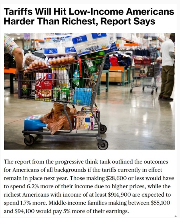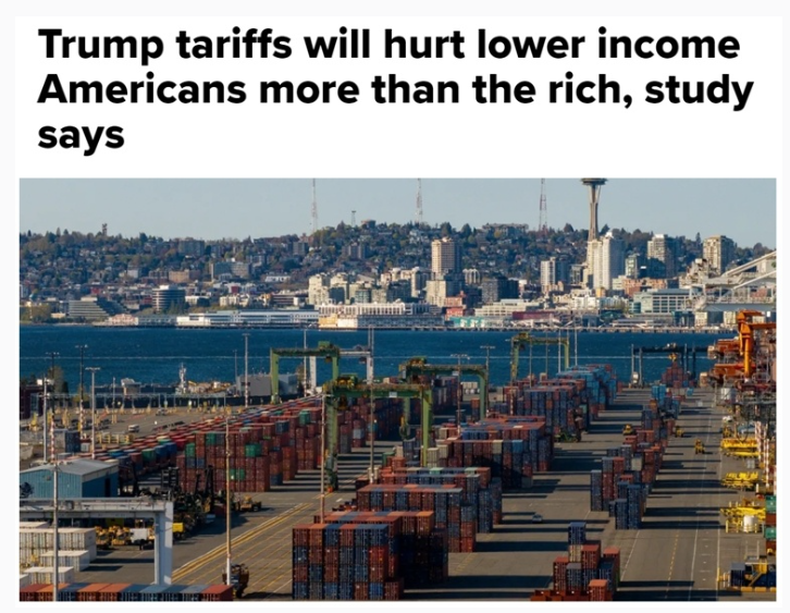 用耶鲁预算实验室主任、白宫经济顾问委员会前首席经济学家厄尼·特德斯奇的话说,“美国低收入人群受到关税的影响会更大”。