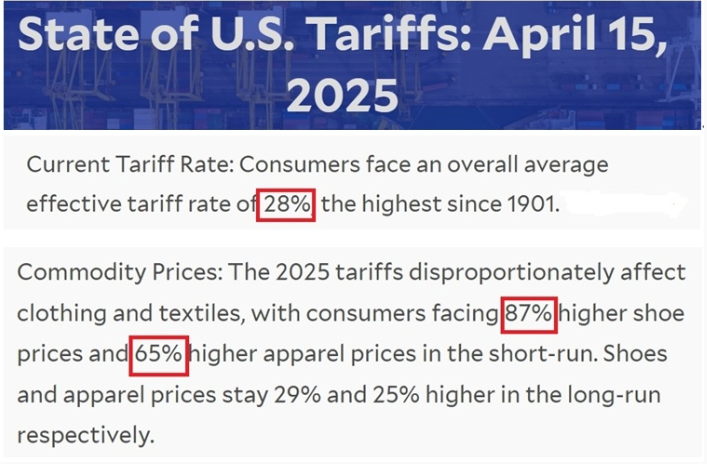 其中,关税对服装和纺织品价格的影响尤为明显,鞋类和服装的价格短期内将分别大幅上涨87%和65%。