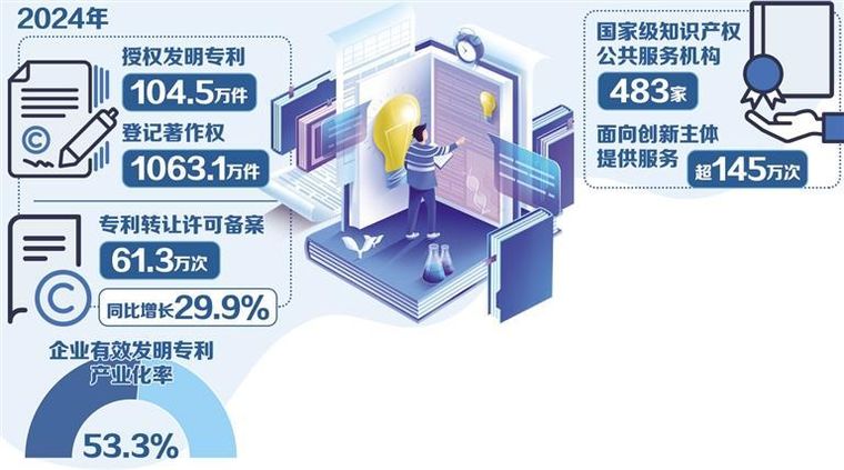 国家知识产权局局长申长雨在24日举行的新闻发布会上介绍,我国专利数量和质量稳步提升,2024年全年授权发明专利104.5万件,知识产权强国建设迈出新步伐。