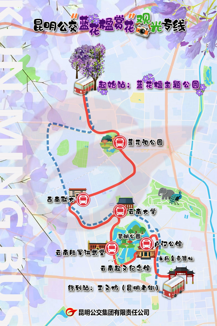 观光专线将在4月28日至蓝花楹花期结束期间运行。线路途经蓝花楹主题公园(起始站)、莲花池公园(去)、西南联大旧址、云南大学、云南陆军讲武堂(去)、云南起义纪念馆(去)、卢汉公馆(去)、永历皇帝遗址、正义坊昆明老街(终到站)9个站点,每日10:00至18:00期间,自蓝花楹主题公园10:00、11:00、12:00、13:00、14:00、15:00、16:00、17:00、18:00定时发车。票价25元/人,每张车票附赠蓝花楹主题文创雪糕一支,不使用爱心卡、学生卡,乘客可凭当日票不限次数乘坐观光专线。