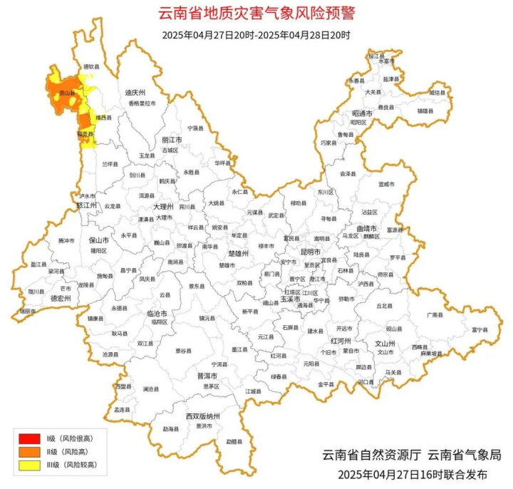 预计,4月27日20时至4月28日20时,怒江州贡山县、福贡县,迪庆州维西县发生滑坡泥石流的风险高;怒江州北部、中部,迪庆州西部发生滑坡泥石流的风险较高。