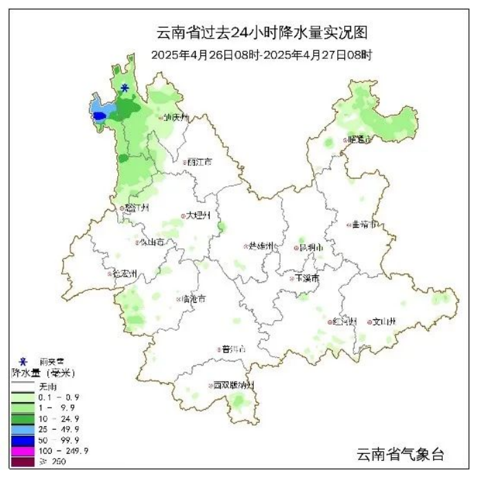 4月26日8时至27日8时,怒江州北部、迪庆州西北部降中到大雨局部暴雨,德钦县出现雨夹雪,其他地区晴间多云有分散阵雨。