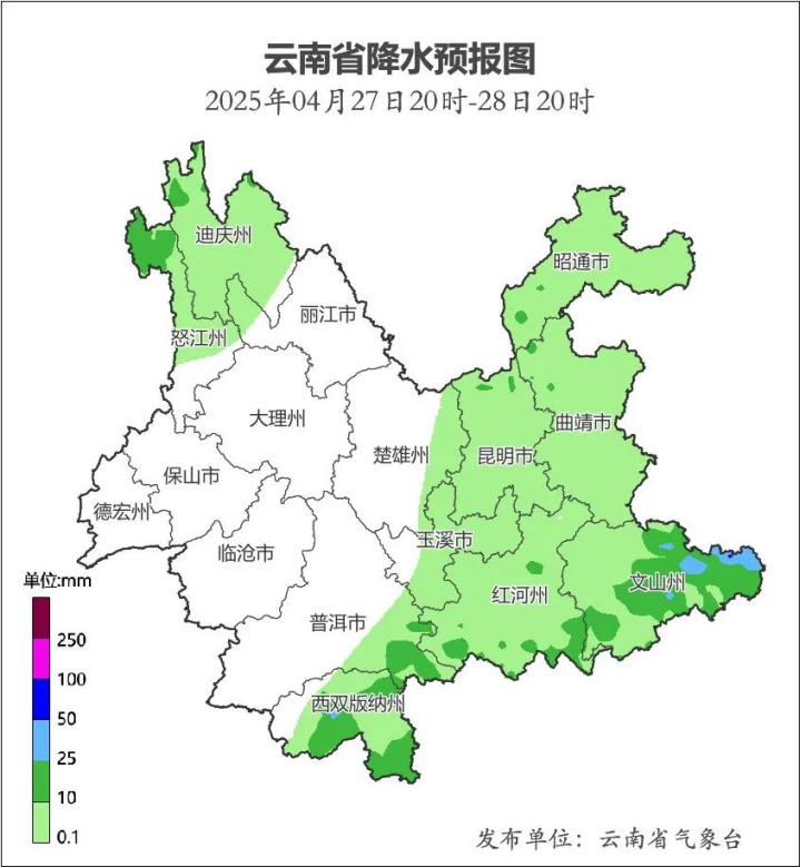 4月27日20时到4月28日20时:文山州东部阴有中雨局部大雨,昭通市、曲靖市、昆明市、文山州西部、红河州、玉溪市东部、普洱市东南部、西双版纳州、迪庆州北部、怒江州北部多云间阴有阵雨局部中雨,其他地区多云间晴。