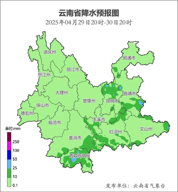 4月29日20时到4月30日20时:曲靖市、昆明市、红河州、玉溪市、普洱市南部、西双版纳州阴有小到中雨局部大雨,其他地区多云有阵雨。