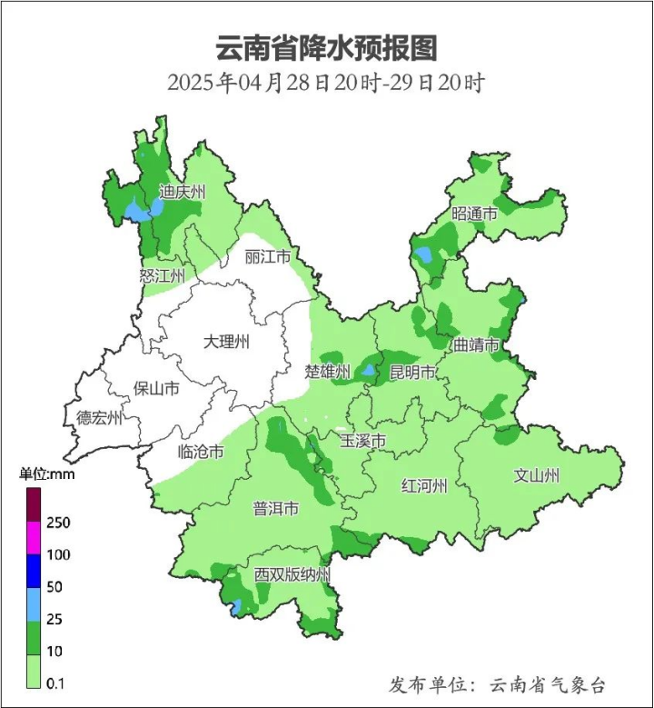 4月28日20时到4月29日20时:昭通市、曲靖市、昆明市、文山州、红河州、玉溪市、楚雄州东部、普洱市、西双版纳州、迪庆州北部、怒江州北部多云间阴有阵雨局部中雨,其他地区多云局部有阵雨。