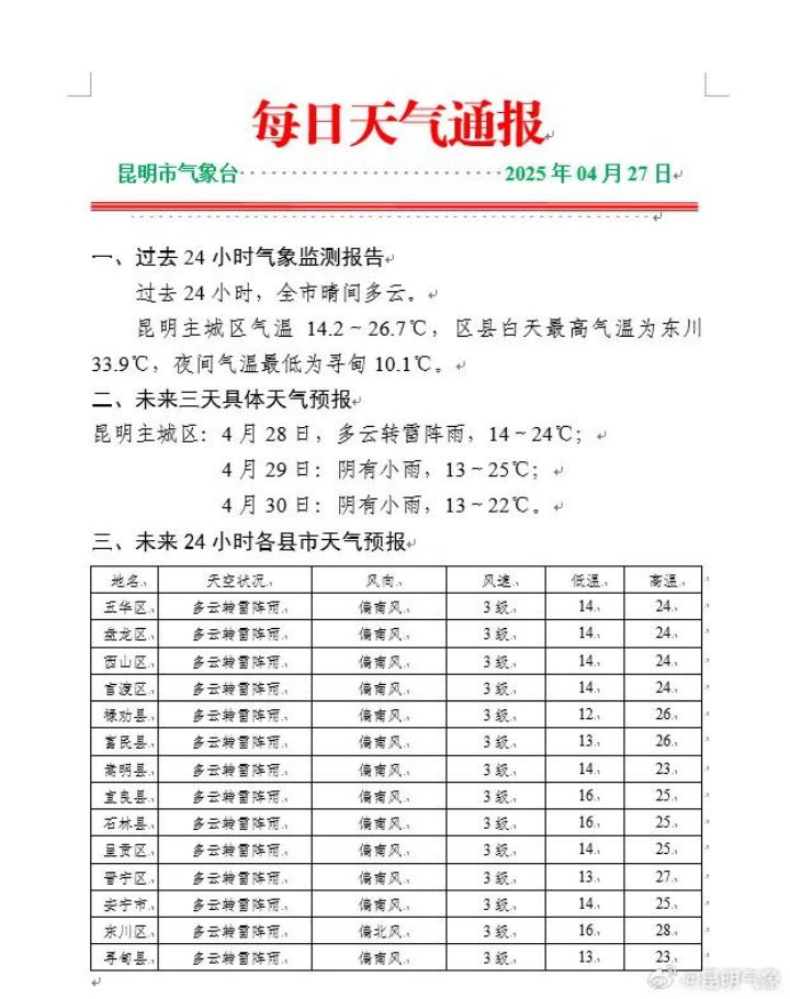 据昆明气象,4月27日,昆明最高气温29℃;4月28日,最高气温24℃,多云转雷阵雨。虽然气温有所下降,不过温度并不算低。大家出门记得带上雨具。