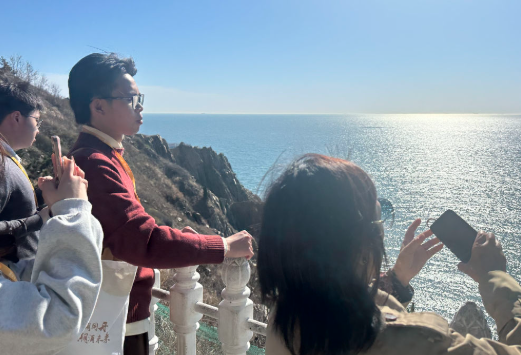 台湾学生简星宇(右二)与同学在大连旅顺老铁山观景台俯瞰黄渤海分界线(4月24日摄)。新华社记者 李妍 摄