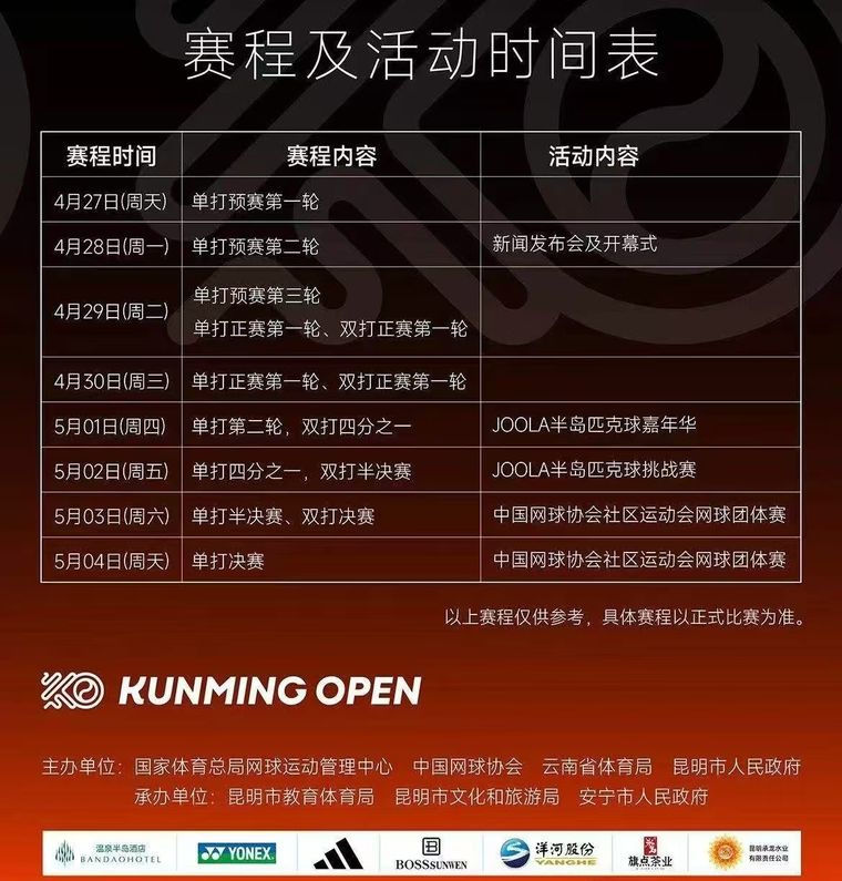 昆明网球公开赛是云南省的精品赛事之一,今年是连续举办的第十四年,本届赛事由国家体育总局网球运动管理中心、中国网球协会、云南省体育局、昆明市人民政府共同主办,昆明市教育体育局、昆明市文化和旅游局、安宁市人民政府共同承办。