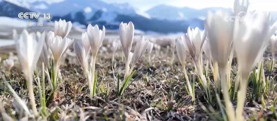 这些粉白的野果花就是野苹果树送给春天的礼物。它们漫山遍野、丛丛簇簇,粉白的花瓣在阳光的照耀下,绽出一种素净的灿烂。而在更高处的雪线附近,顶冰花正与冰雪“博弈”。这些天山最早盛开的花朵,用柔嫩的花苞顶开冻土,淡紫色的花朵顶冰而绽,肆意盛开。
