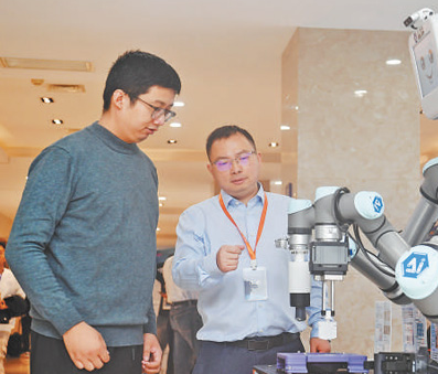 江俊(右)在介绍机器化学家“小临”。受访者供图