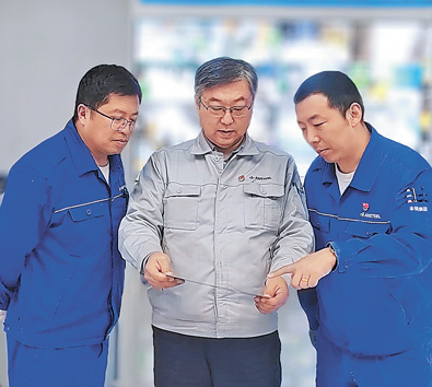 刘晓峰(中)和技术人员在研究汽车钢产品的质量稳定性。本钢集团党委宣传部供图