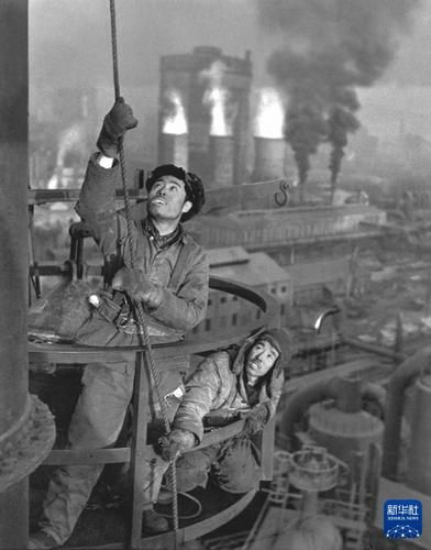 20世纪50年代初,鞍山钢铁公司工人在修建高炉。新华社发(蔡尚雄 摄)