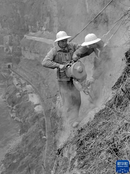 1974年3月,四川西昌铁路分局乌斯河工务段工人排除大渡河两侧悬崖峭壁上的危岩和孤石,保证成昆铁路安全通车。 新华社记者 李基禄 摄