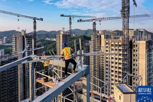 2022年10月20日,工人在广东深圳福田区华富村回迁安置房楼顶进行幕墙装配作业。 新华社记者 刘大伟 摄