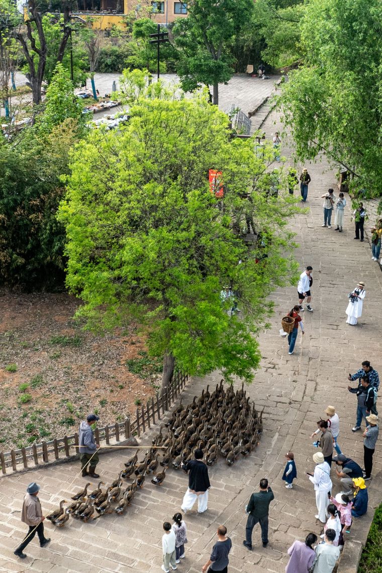 云南省大理州沙溪镇寺登村村民将鸭子赶回家(无人机照片,4月19日摄)。新华社记者胡超 摄