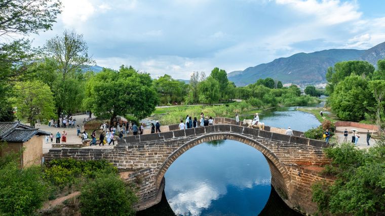 云南省大理州沙溪镇寺登村村民与游客通过玉津桥(4月18日摄)。新华社记者胡超 摄
