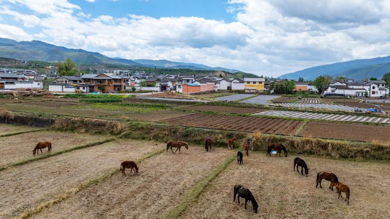 云南省大理州沙溪镇寺登村村民养殖的马匹在田间觅食(无人机照片,4月20日摄)。新华社记者刘莲芬 摄
