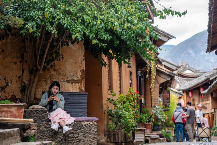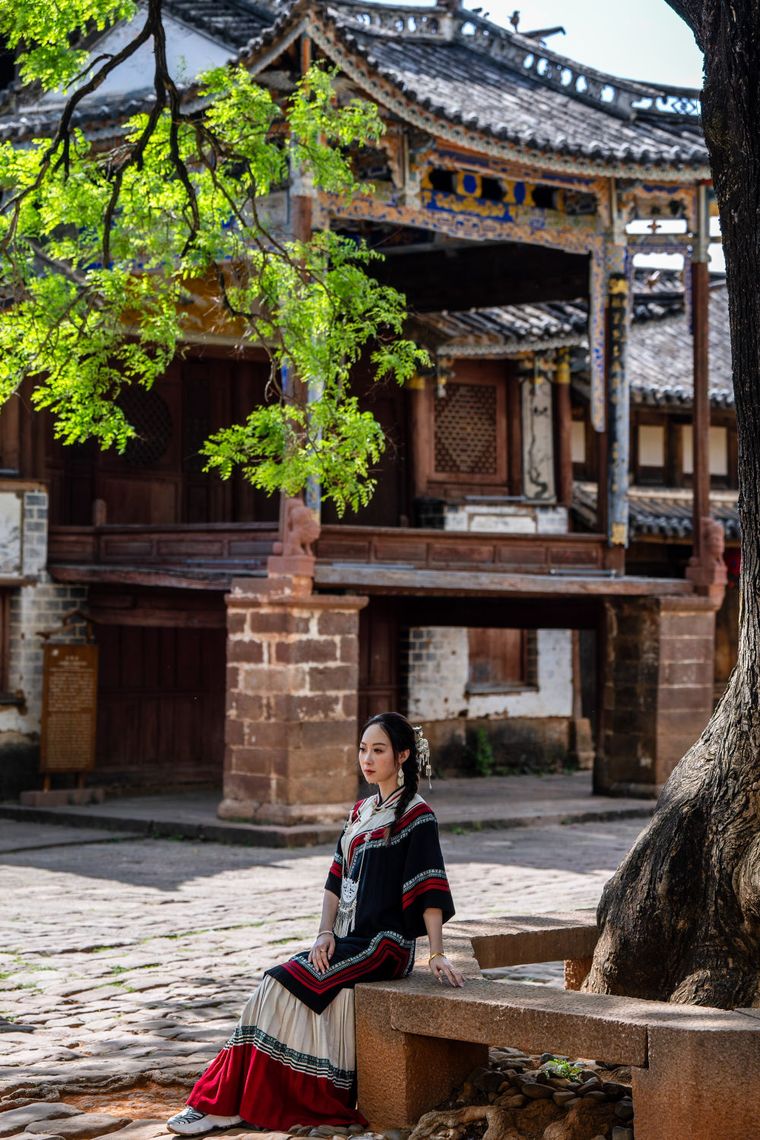 游客在云南省大理州沙溪镇寺登村古戏台前拍照留念(4月18日摄)。新华社记者胡超 摄