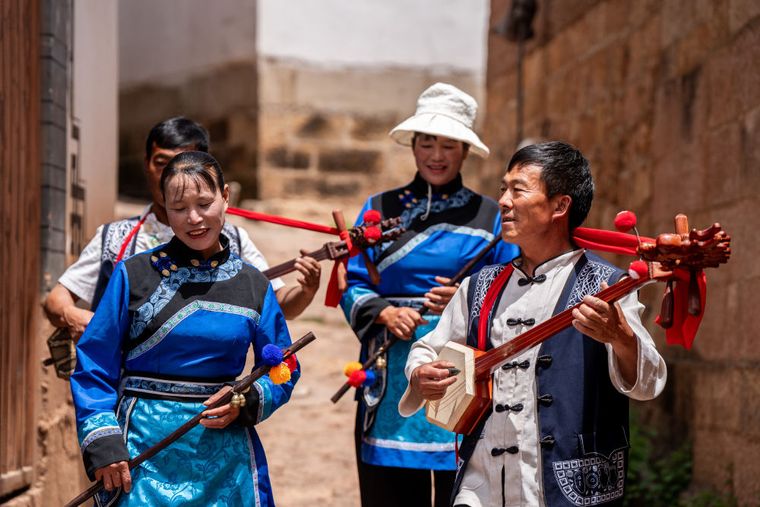 在云南省大理州沙溪镇石龙村,石宝山歌会国家级非遗传承人姜伍发(右二)和徒弟在排练节目(4月19日摄)。新华社记者胡超 摄